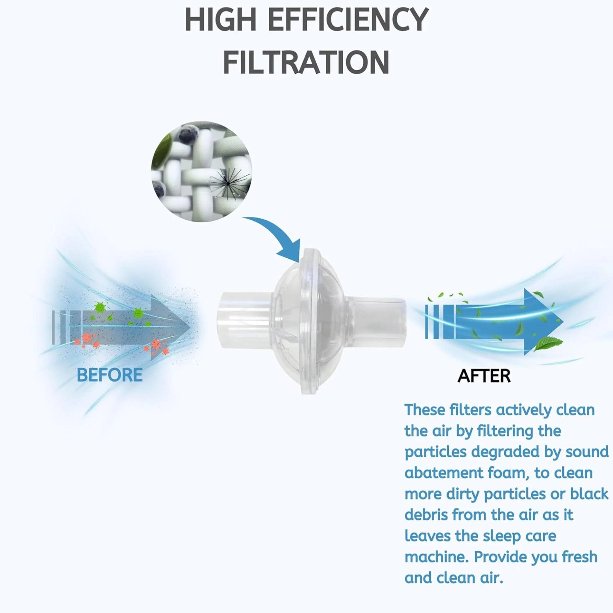 Effective Filtration: Traps dust, pollen, and other airborne particles, ensuring cleaner air delivery to the user. With a low flow resistance of approximately 5.6 mmH2O at 30 LPM, it promotes not to impact the performance of your machine, maintaining optimal airflow and ensuring uninterrupted session throughout the night