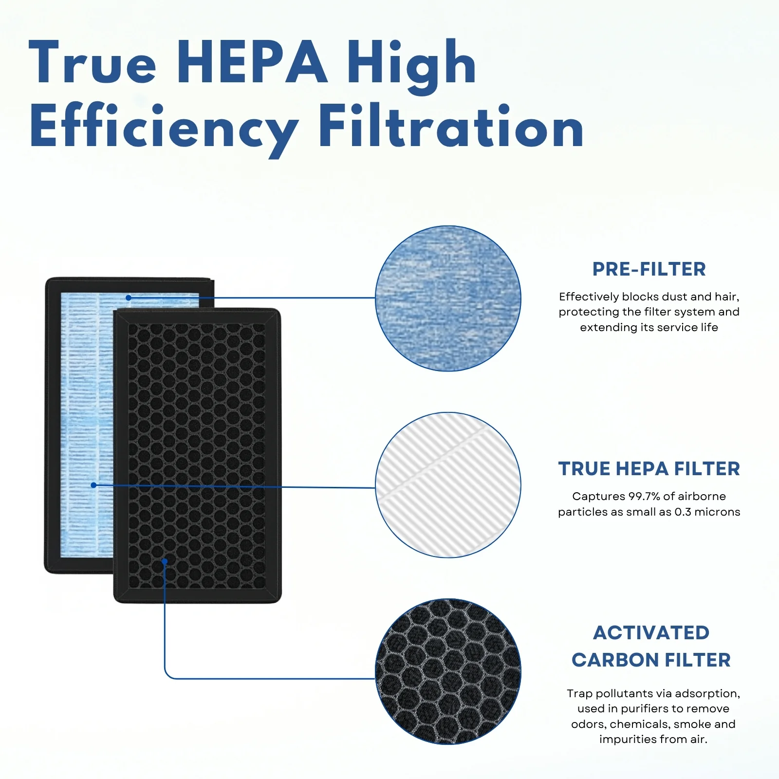 - High quality HEPA filter captures 99.97% of airborne particles down to 0.3 microns. Activated Carbon deodorizes unfavorable Odors & harmful VOCs. Preliminary blue layer prevents big particles like hair, debris, pet fur etc from getting side the air purifier that helps extend the filter life span